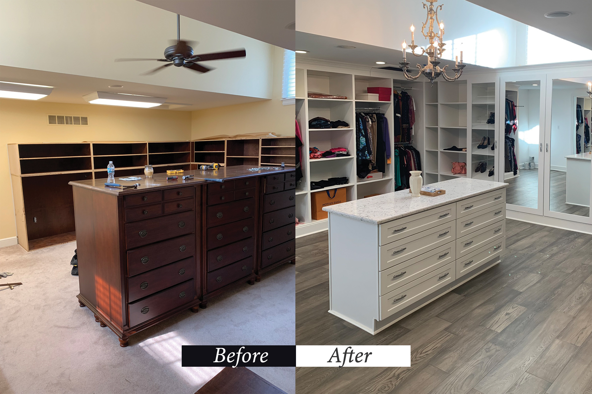 Transform your closet into a custom storage system designed to fit your lifestyle. From walk-in closets with islands and built-in shelving to reach-in configurations with maximized organization — every detail is carefully planned and expertly installed.